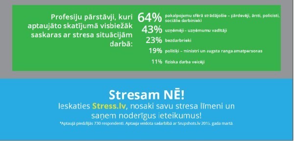 Pēc aptaujāto Vidzemes iedzīvotāju domām ar stresa situācijām darbā visbiežāk saskaras pakalpojumu sfērā strādājošie (pārdevēji, ārsti, sociālie darbinieki), bet visretāk – fiziska darba veicēji. Vienlaikus 34% aptaujāto vidzemnieku uzskata, ka stresu visbiežāk izjūt bezdarbnieki. Lai apzinātos, cik lielu ietekmi uz katru no mums atstāj stress, ikviens iedzīvotājs aicināts noteikt individuālo stresa līmeni vietnē www.stress.lv. Jānorāda, ka “Snapshots” aptauja veikta 2015. gada martā, aptaujāti 726 respondenti vecuma grupā no 15 līdz 74 gadiem (dati svērti atbilstoši Iedzīvotāju reģistra datiem).
