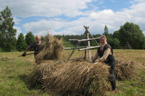 Pūš silts vējiņš, saule kautrīgi laipo starp mākoņiem. Vilma un Jānis Drozdovski pļavā vāc sienu.