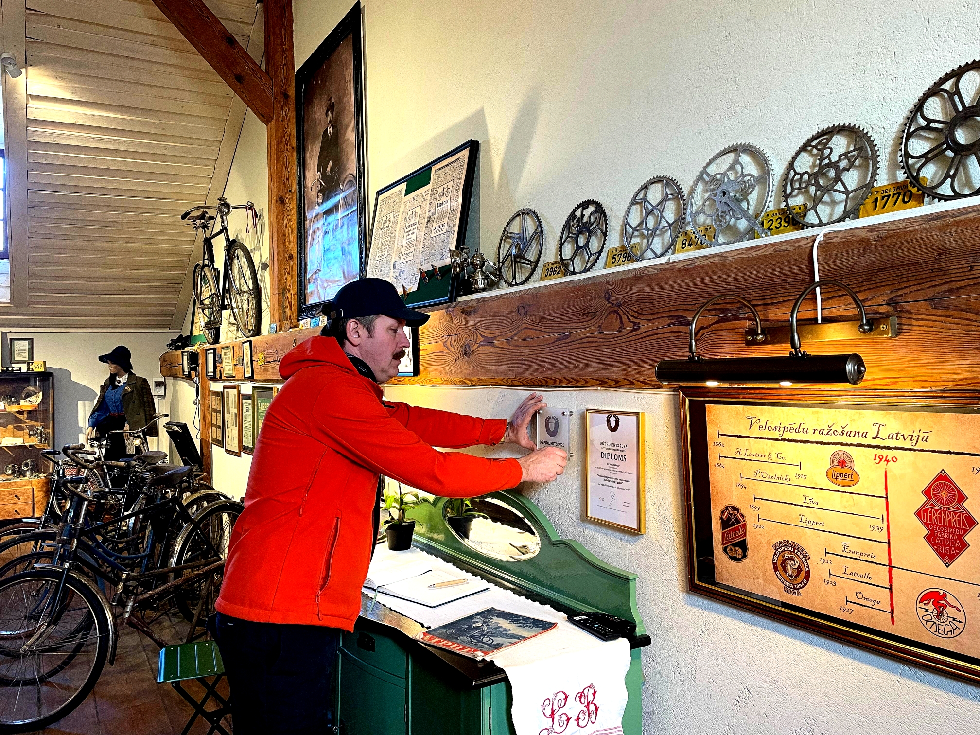 Sudraba “Dižprojekts”. Novērtējuma zīme Seno velosipēdu muzejā saimniekam Mārtiņam Belickim atgādinās, ka, lai kaut ko sasniegtu, ir jāuzdrošinās. FOTO: no albuma