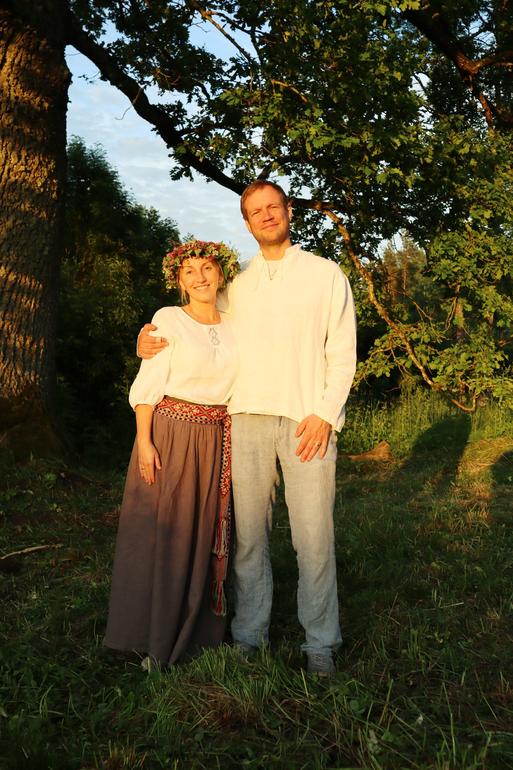 VASARAS SAULGRIEŽOS. Inese Kozuliņa ar vīru Austri svētkus svin saskaņā ar dabas ritu. FOTO: no albuma