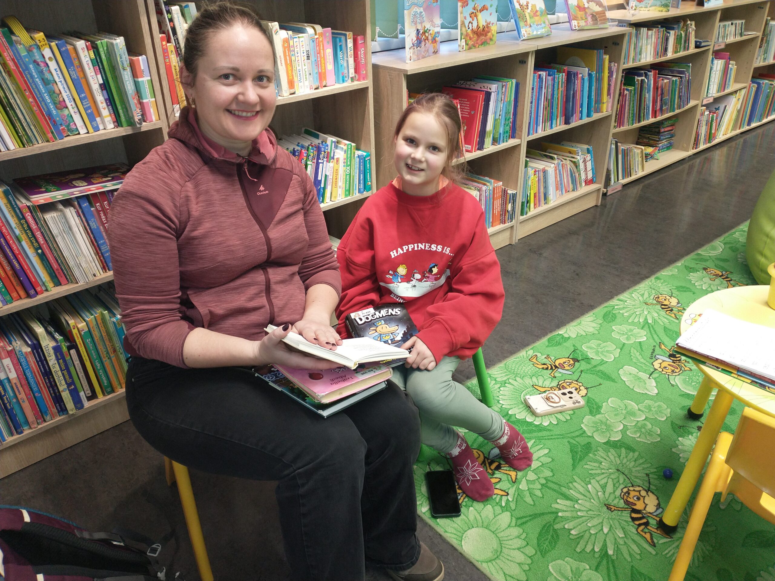 Šī man patiks. Rasa ar mammu Madaru lasīšanai izvēlas grāmatas. FOTO: Sarmīte Feldmane
