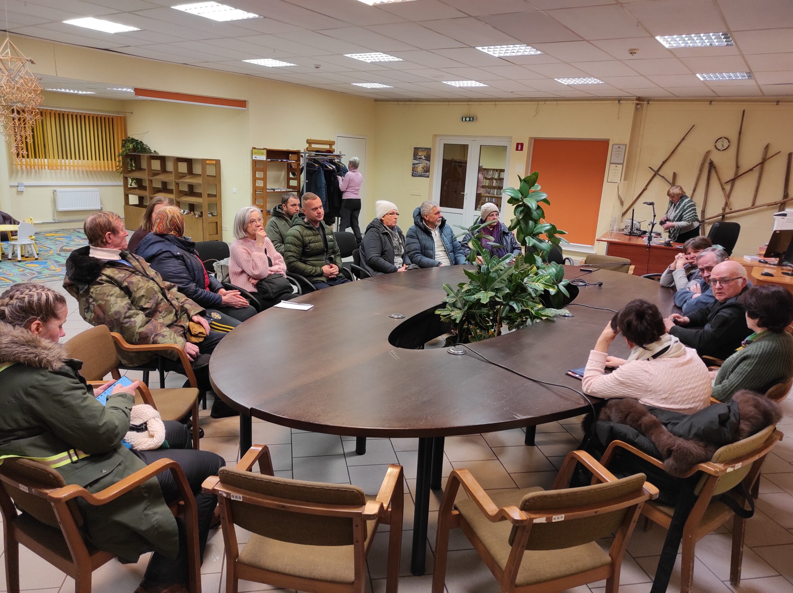 Apaļais galds mudina izteikties. Drabešu iedzīvotāju padomes sēdē Līvu bibliotēkā tika uzklausīti visi sanākušie ciematnieki, katrai sāpei un sūdzībai veltot nopietnu uzmanību. FOTO: Līga Salnite
