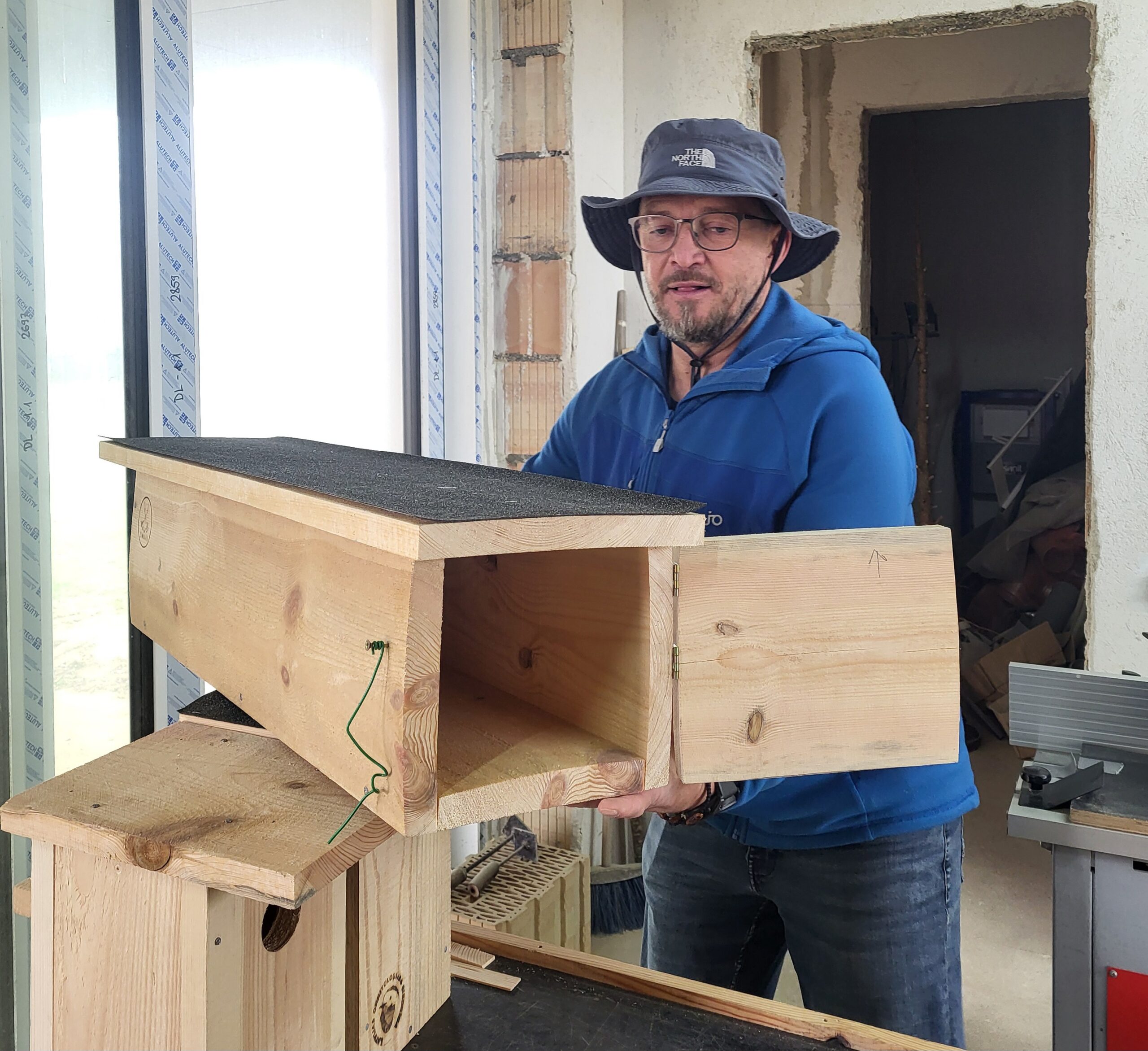 Namiņš pupuķim. SIA “Simbaro” īpašnieks Valdis Zariņš rāda, ka vienam no Latvijas skaistākajiem putniem – pupuķim - top paliela māja, kura veidota tā, lai palīdzētu putnam būt pasargātam no caunām. FOTO: Agnese Leiburga