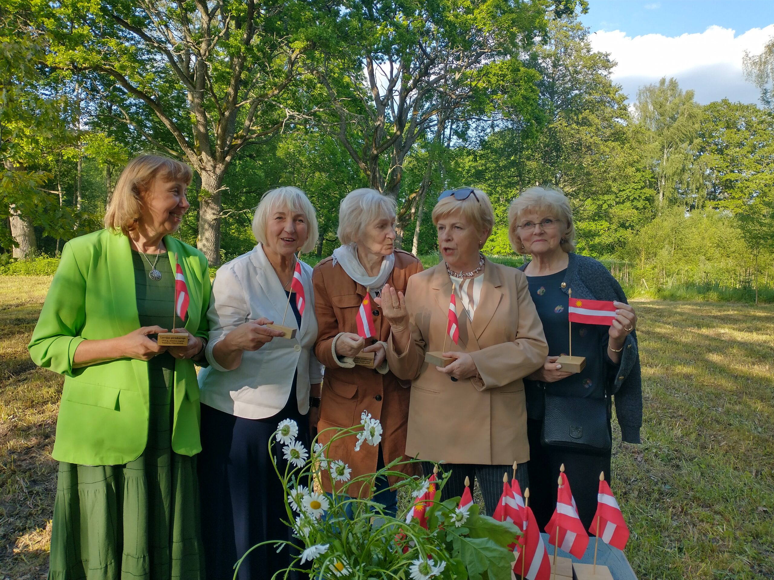 “Lejas Pintuļu” plašajā pagalmā. Jāņa Lapiņa mazmeitas Indra Krūze (no labās) un Edīte Lapaine kopā ar karoga darinātāju Maiju Ulmi, veselavietēm Ingrīdu Renci un Daci Kalniņu. FOTO: Sarmīte Feldmane