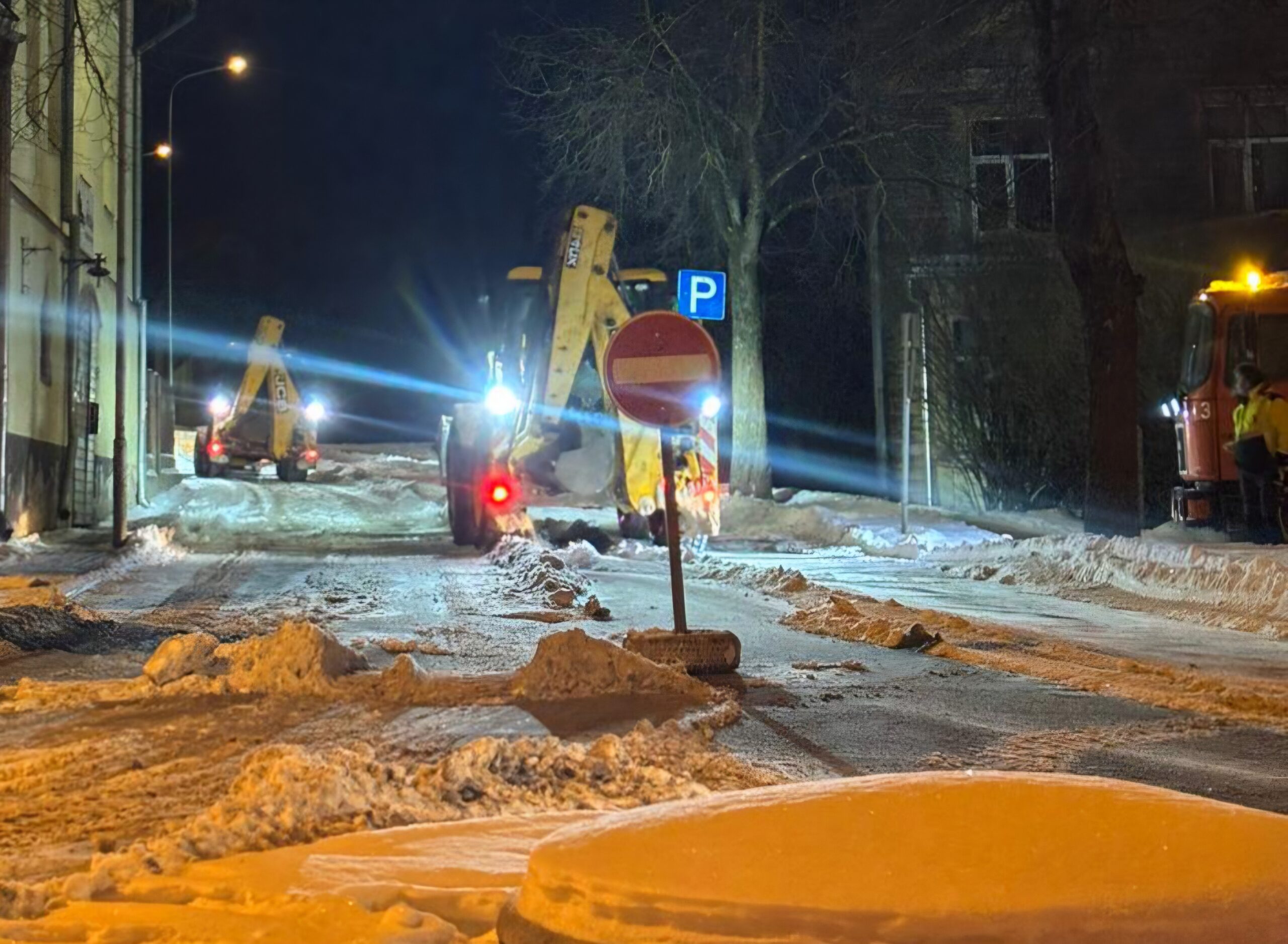 Kad pierimst satiksme, izved sniegu. Cēsīs, Vaļņu ielā, tehnika strādāja trešdienas, 18.februāra, vēlā vakarā. Daži autovadītāji tomēr nebija pamanījuši agri no rīta izvietotās stāvēšanas aizlieguma zīmes, kādas mašīnas bija atstātas ielas malā, bet kopumā darbs paveikts. FOTO: Iveta Rozentāle