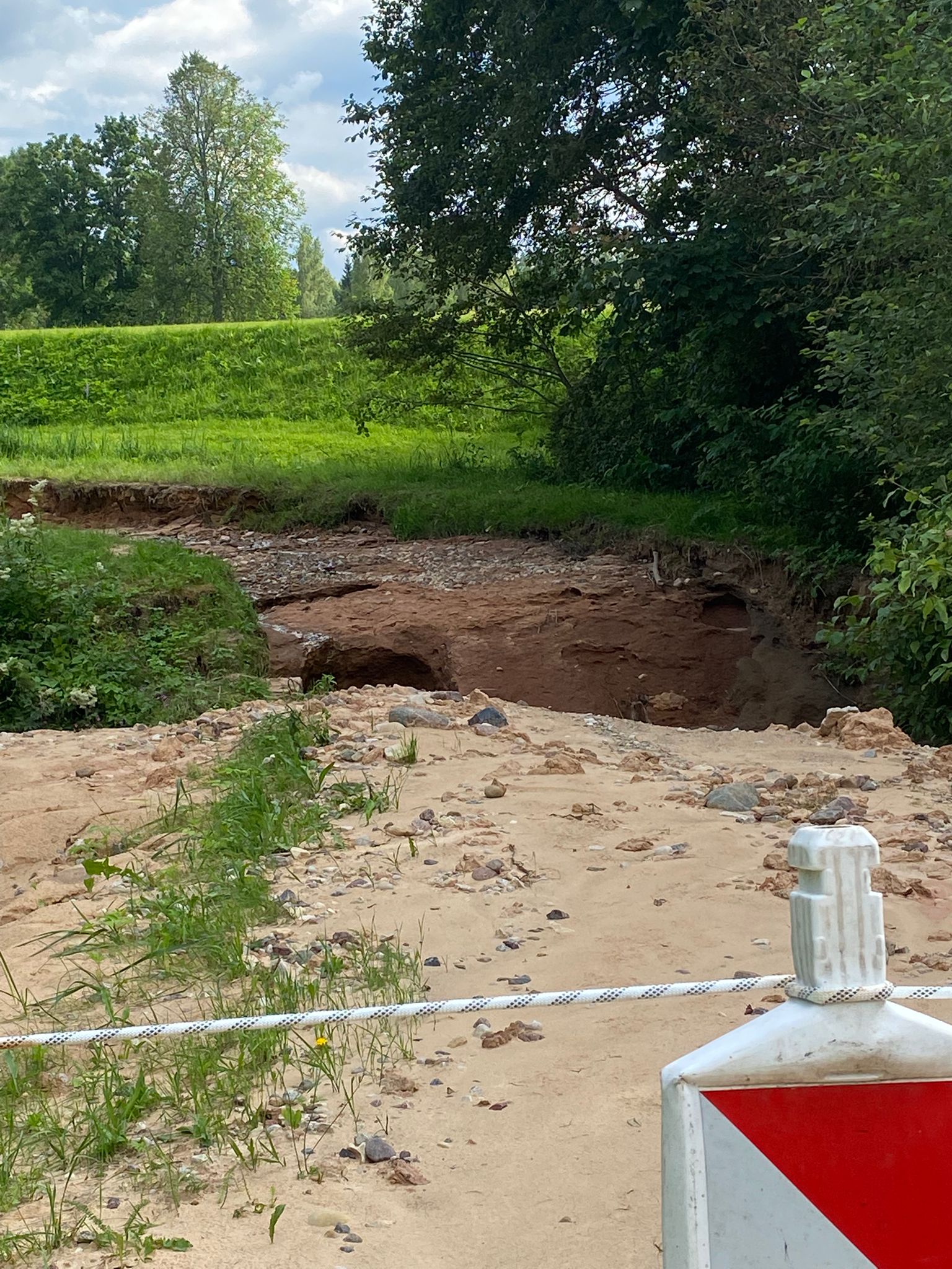 Smagākais bojājums ir uz ceļa “Rauņi–Vilki–autoceļš Nr. 11”, kur izskalota caurteka, ceļš pilnībā pārrauts. Objektu apsekojusi būvvalde. Tā kā ceļš ved uz viensētu, tad kopā ar māju saimniekiem situācijai vēl tiek meklēti labākie risinājumi. E. Šīrante skaidro, ka pagaidām vēl nav iespējams pateikt, cik laika aizņems ceļa atjaunošanas darbi. “Druva”, izbraucot šo ceļa posmu, pārliecinājās, ka citviet ceļš ir labā stāvoklī, bet tieši vietā, kur ved uz pēdējām mājām, ir pilnībā izskalots un šobrīd norobežots.