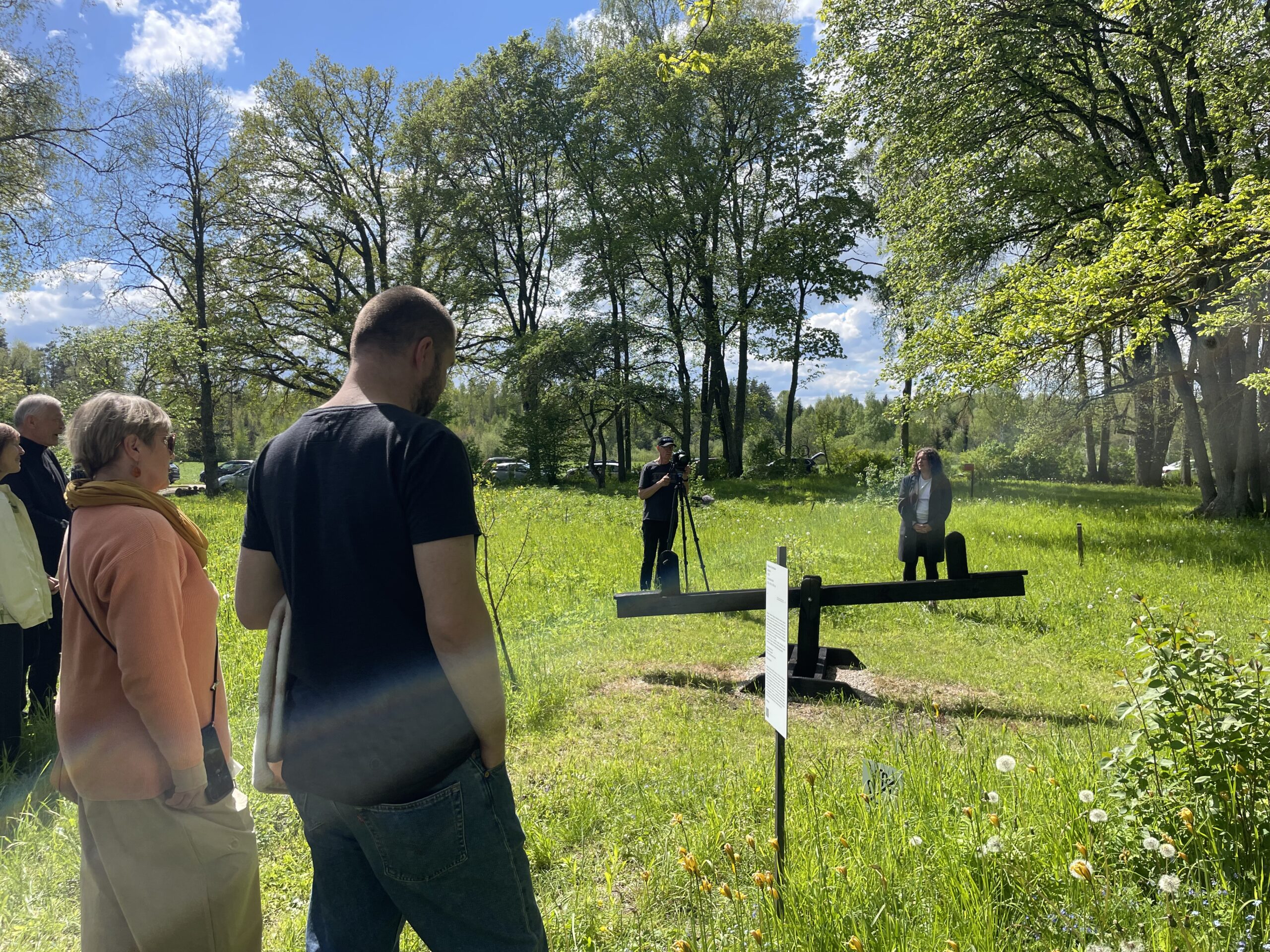 Madara Gruntmane par savu darbu “Šūpoles” stāstīja, ka tas simbolizē dzejnieka skaudro pasaules redzējumu. Viņš varēja priecāties un nākamajā brīdī jau būt pesimistisks. Reizēm cilvēks var pārdegt no emocionalitātes un būšanas te augšā, te lejā un palikt pozīcijā, kurā viņš apstājas. Māksliniece uz to iesaka neskatīties kā uz depresīvu, bet gan kā uz jaunu sākumu. Viņa šūpolēm izvēlējusies dedzinātu koku, arī caur šo materiālu aktualizējot mentālās veselības nozīmi ikviena un sabiedrības dzīvē kopumā.