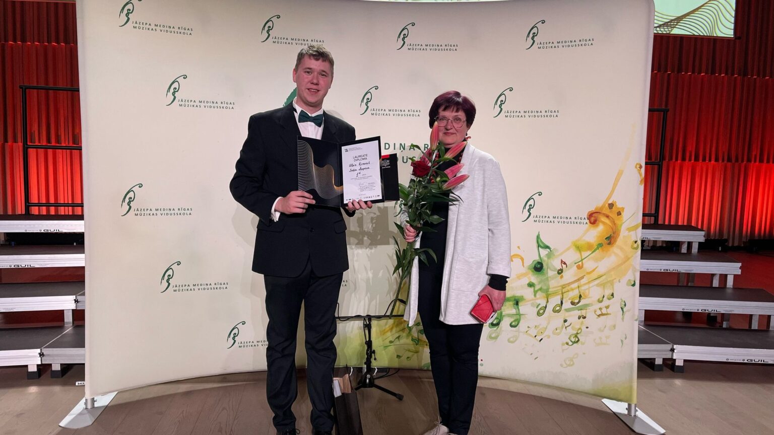 Laureāts. Alfrēda Kalniņa Cēsu Mūzikas vidusskolas 4.kursa audzēknis Ulvis Krieviņš un viņa pedagoģe Iveta Lapiņa Imanta Kokara 5. Starptautiskā jauno kordiriģentu konkursā. FOTO: no albuma