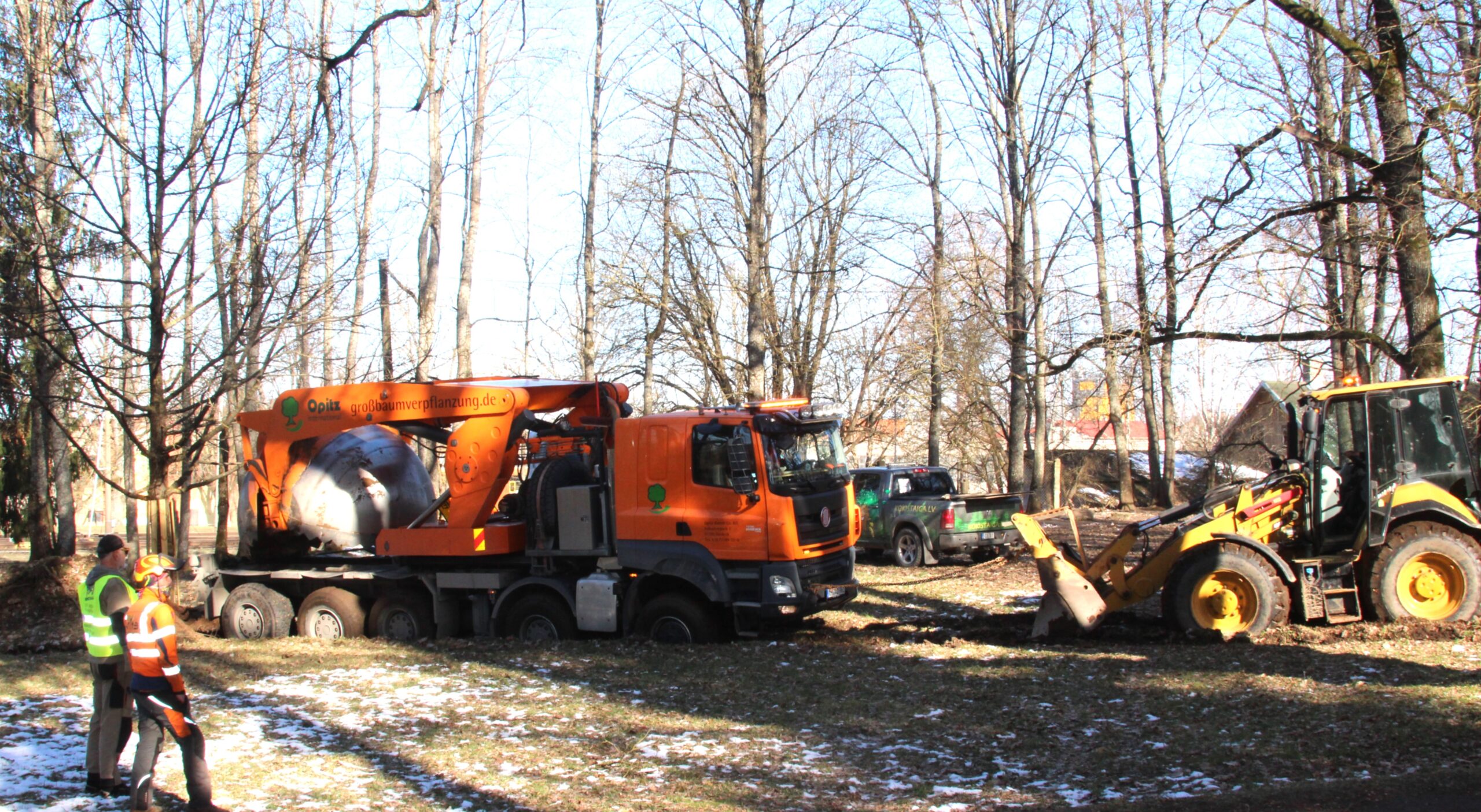 Tiešām staigā. Uzņēmuma “Koki staigā” rīcībā ir atbilstoša tehnika dažāda izmēra un vecuma koku saudzīgai izcelšanai un pārstādīšanai. Ruckas parkā radās neparedzēts kavēklis, jaudīgā koku pārvešanas un stādīšanas mašīna iestiga. FOTO: Jēkabs Saknītis
