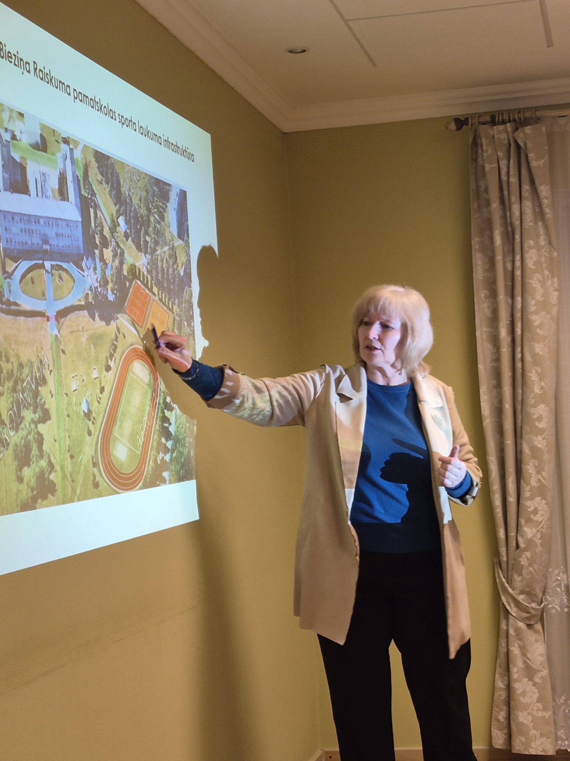 Iepazīstina. Aleksandra Bieziņa Raiskuma pamatskolas direktore Lolita Žagare klātesošos iepazīstināja ar ieceri par mūsdienīgu stadionu, kas būtu noderīgs ne tikai skolas audzēkņiem, bet arī vietējiem iedzīvotājiem. FOTO: Iveta Rozentāle