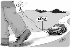 Oi, Dievs, palīdzi un glāb Visas Cēsis pilnas SAAB! Izbraukā mums visus krūmus. Mākoņiem pūš laukā dūmus.