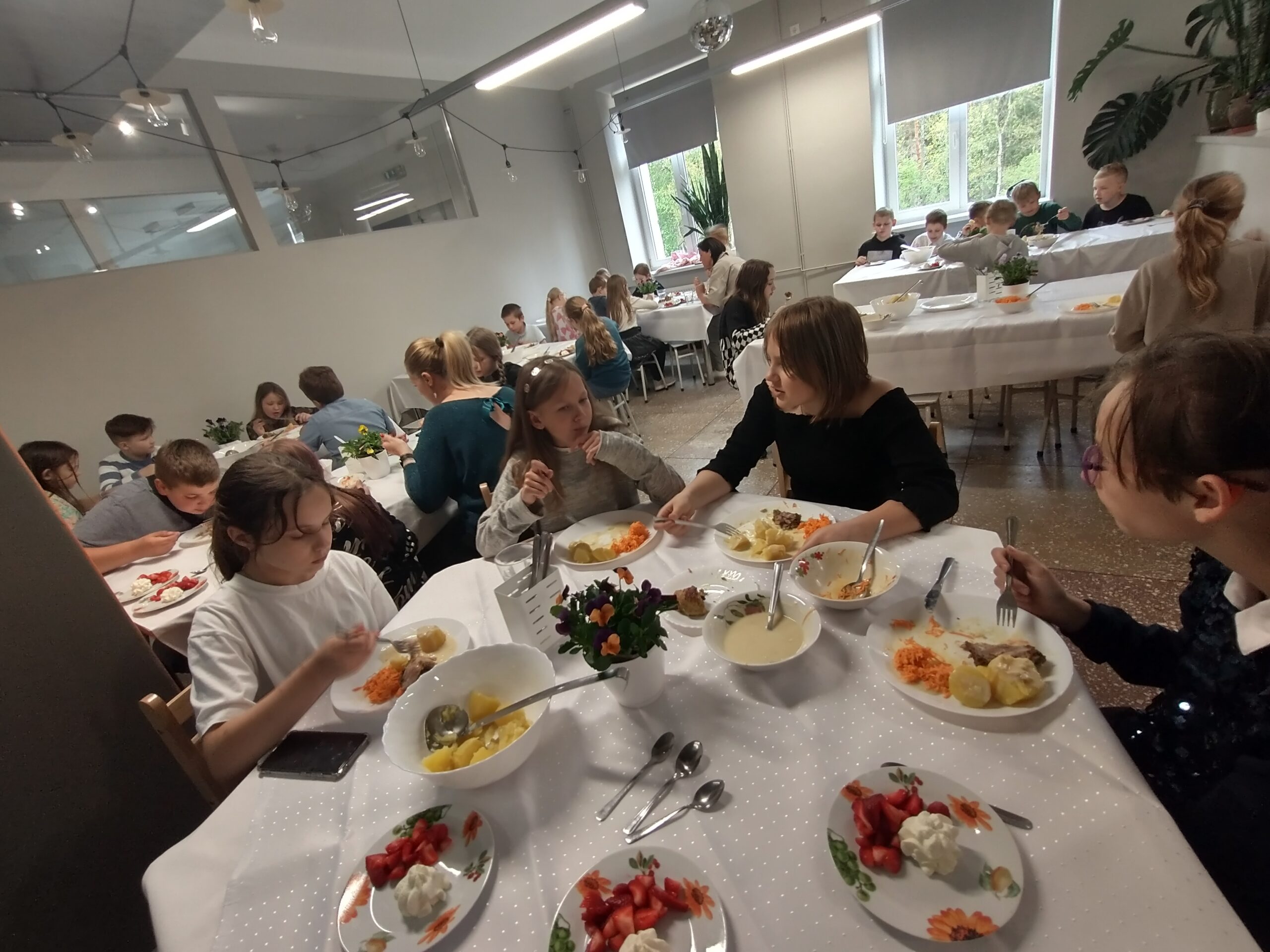 Pēc vairākām stundām svaigā gaisā skolēni atgriezās skolā. Tur viņus gaidīja svētku pusdienas. “Svētkos galdā ceļam to, kas bērniem garšo. Gaļa, kartupeļi ar mērci un burkānu salāti spēkam, bet , tā kā bērniem ļoti garšo zemenes, desertā ir zemenes ar putukrējumu,” pastāsta pavāre Solvita Leimane un uzsver, ka tādas pašas pusdienas ir arī abos Līgatnes bērnudārzos un sākumskolā.