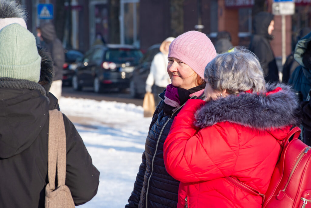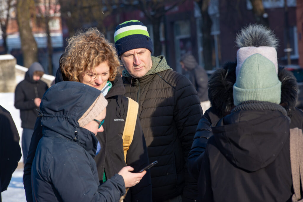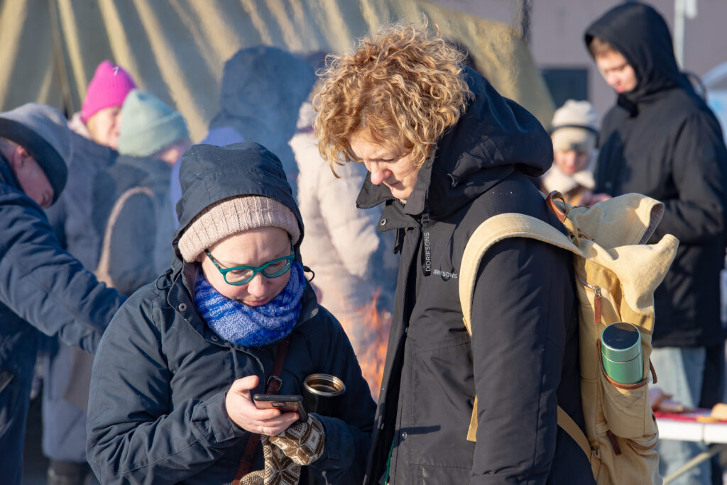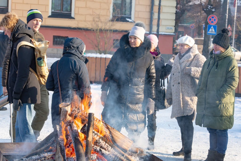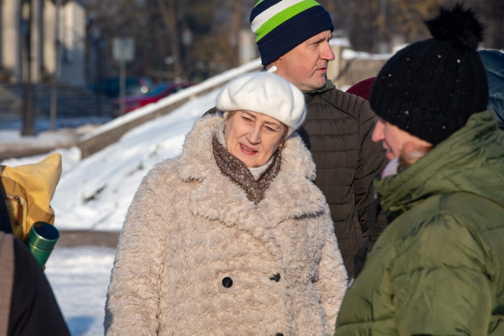 “Druvas” komanda 20.janvārī Cēsīs, Vienības laukumā pie barikāžu piemiņas ugunskura (no kreisās): Rudīte Brūvere, Agnese Leiburga, Sandra Deruma, Liga Salnite, Dita Rudzīte, Sarmīte Feldmane, Andra Gaņģe, otrajā rindā Dainis Sprancis. FOTO: Normunds Kažoks