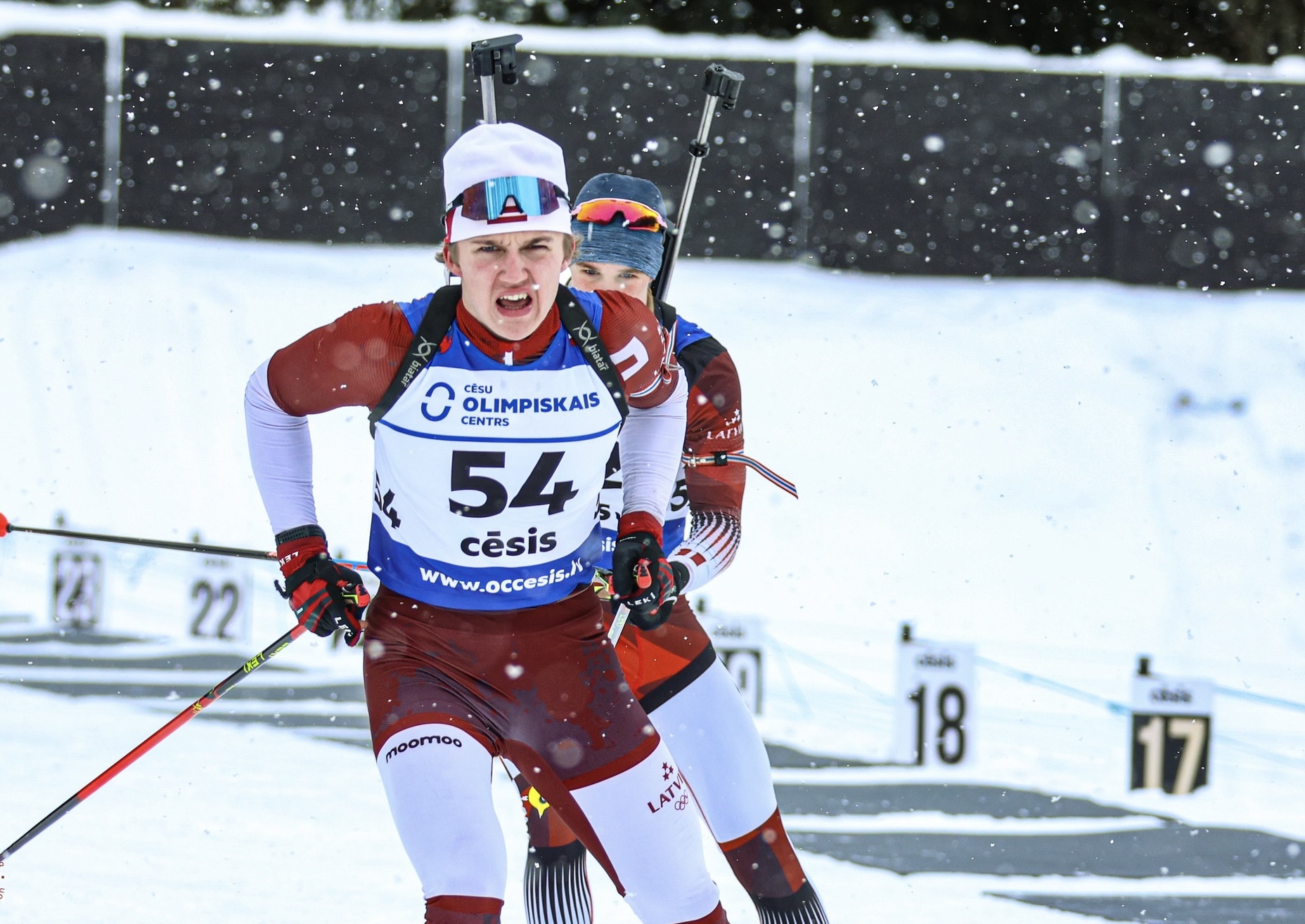 Pretī uzvarai. Latvijas kausa izcīņā biatlonā abās sacensību dienās uz goda pjedestāla augstākā pakāpiena kāpa CPSS audzēknis Rūdolfs Raudziņš. FOTO: Agris Veckalniņš