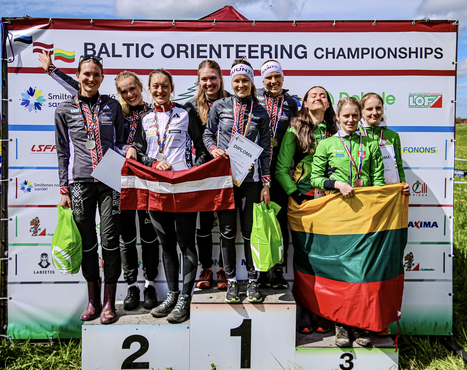 Čempiones. Baltijas čempionātā orientēšanās sportā stafetēs sievietēm elites grupā uz augstākā goda pjedestāla Latvijas pirmā komanda, kurā startēja Leonarda Baltiņa, Sandra Grosberga un Elza Ķuze no Jelgavas kluba “Alnis OK-JNSC”. FOTO: Mareks Gaļinovskis/ FotoManLV